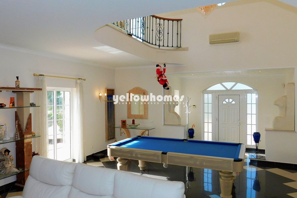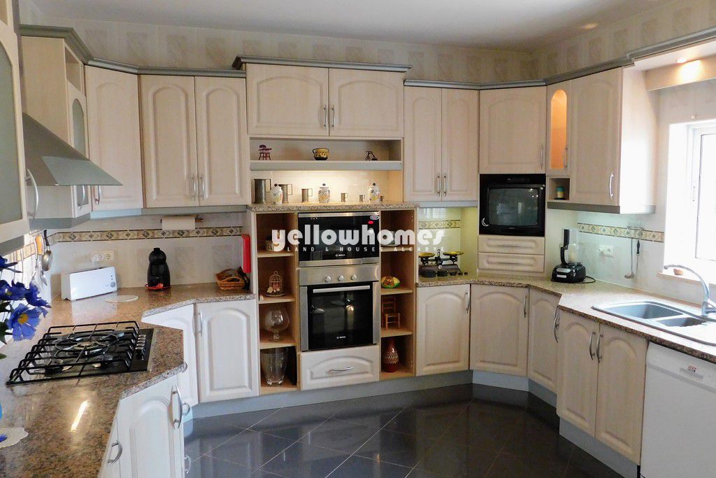 Para venda: Esta propriedade encantadora e espaçosa está convenientemente localizada a uma curta distância de carro da cidade costeira de Vilamoura, no Algarve. A moradia foi construída em 2003 e encontra-se implantada num grande terreno paisagístico e dispõe de bons acessos. A propriedade é composta por um espaçoso hall de entrada, sala de estar com lareira e uma área de jantar com acesso ao terraço. A espaçosa cozinha mobilada e equipada, despensa e acesso a um terraço coberto com BBQ com zona de refeições. Existem ainda 2 quartos, 1 casa de banho e uma casa de banho social no rés-do-chão. Uma escadaria aberta leva ao piso superior, onde encontra mais 2 quartos com roupeiros e uma casa de banho. Uma grande cave dispõe de uma garagem e arrecadação. No exterior encontra-se uma piscina de água salgada com cobertura, terraços cobertos e descobertos, um jardim paisagístico com zonas relvadas, canteiros de flores, várias árvores e abrigo para o carro. Perto de todas as comodidades, lojas, campos de golfe e praias, esta espaçosa vivenda oferece tudo que você necessita.