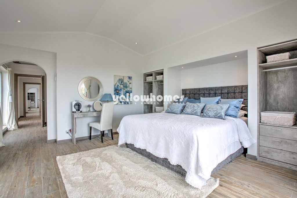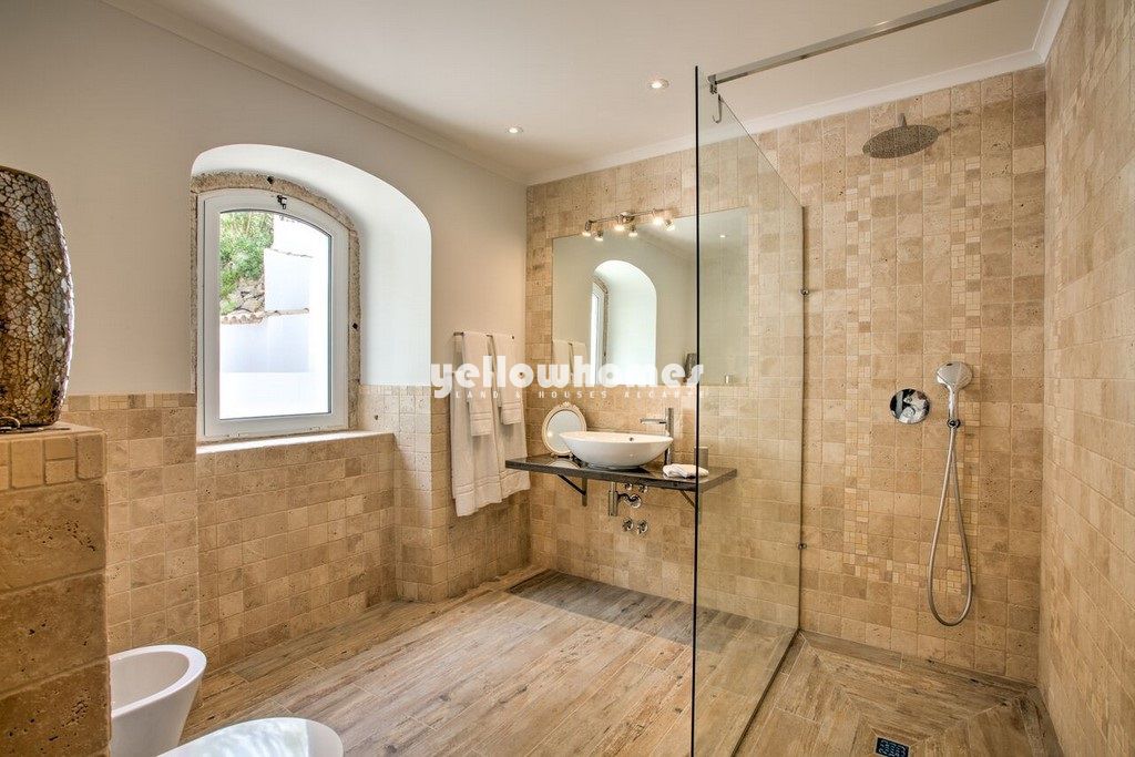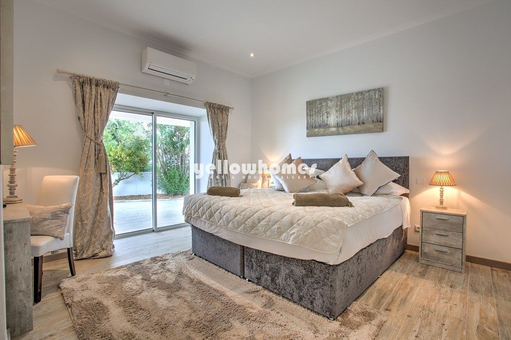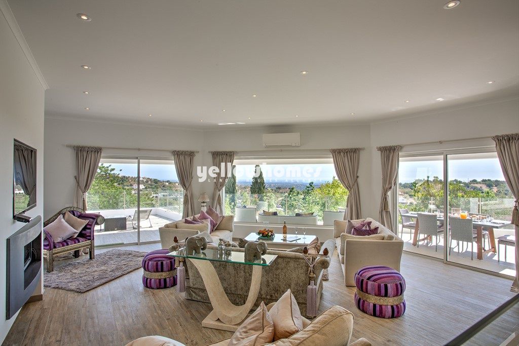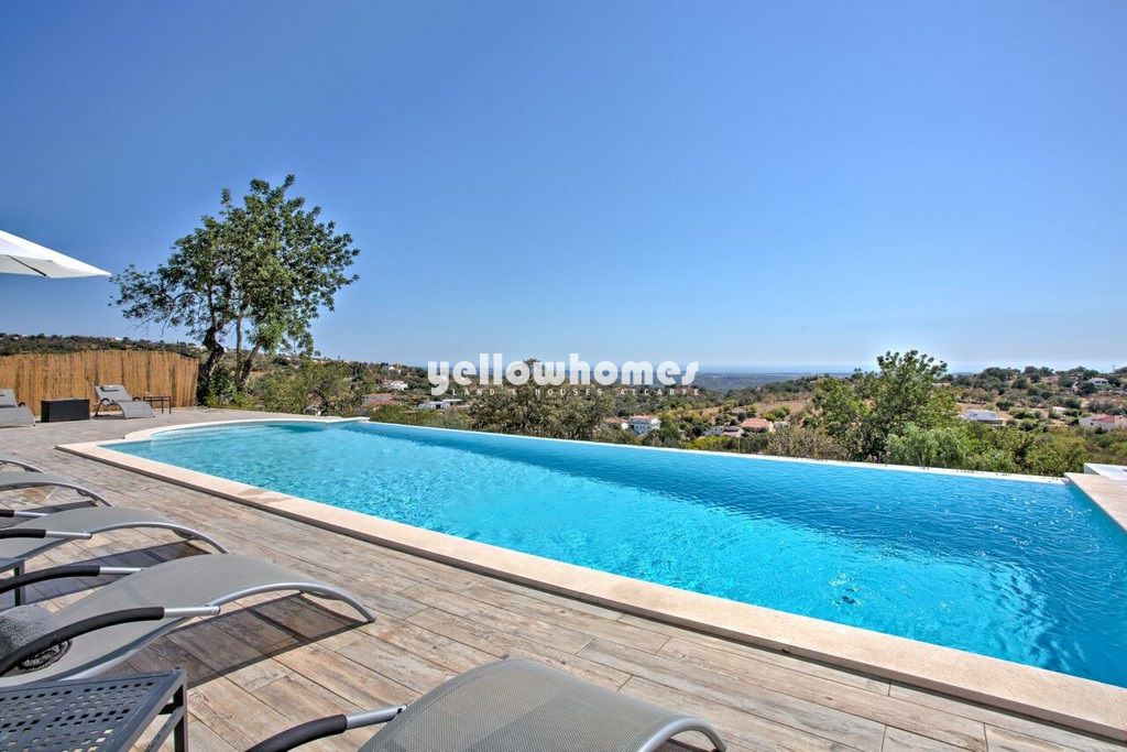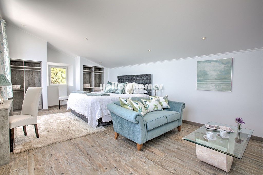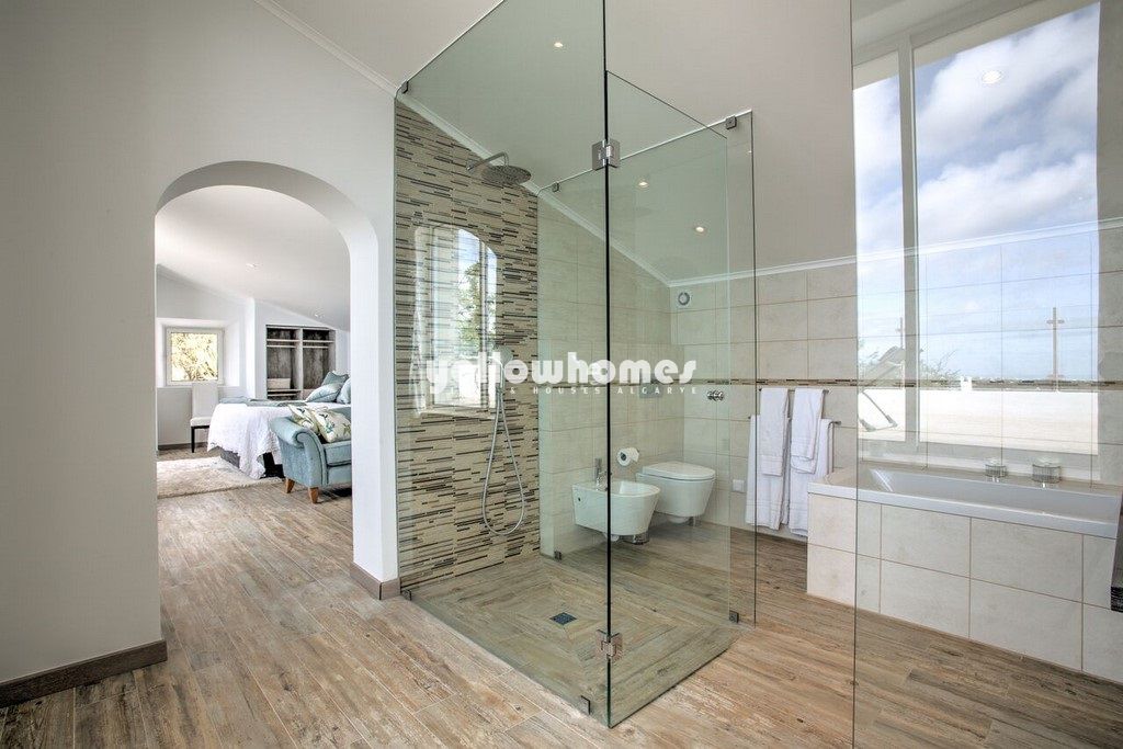Esta quinta foi cuidadosamente convertida numa propriedade contemporânea com 5 quartos e situa-se num ambiente tranquilo e privado, com vistas deslumbrantes sobre a paisagem circundante e o mar. A cidade mercantil de Boliqueime fica a 5 minutos de carro da propriedade e Vilamoura fica a apenas 10 minutos de carro. A propriedade tem acesso através de portões de entrada no final de um beco sem saída e oferece uma garagem e amplo estacionamento. O piso térreo da moradia é composto por um hall de entrada, cozinha mobilada e equipada, sala de jantar, sala de estar com lareira e 3 suítes. O primeiro andar é composto por dois grandes quartos com casas de banho em suite. O imóvel possui um grande pátio e janelas de vidro em todo o lado bem como amplos terraços. A propriedade concentra-se na deslumbrante vista para o campo e para o mar. A moradia beneficia de ar condicionado, piso radiante, jardim de baixa manutenção, piscina de bom tamanho e uma Licença Turística de Alojamento Local. Uma bela propriedade num cenário invejável ideal como residência permanente ou como rendimento.